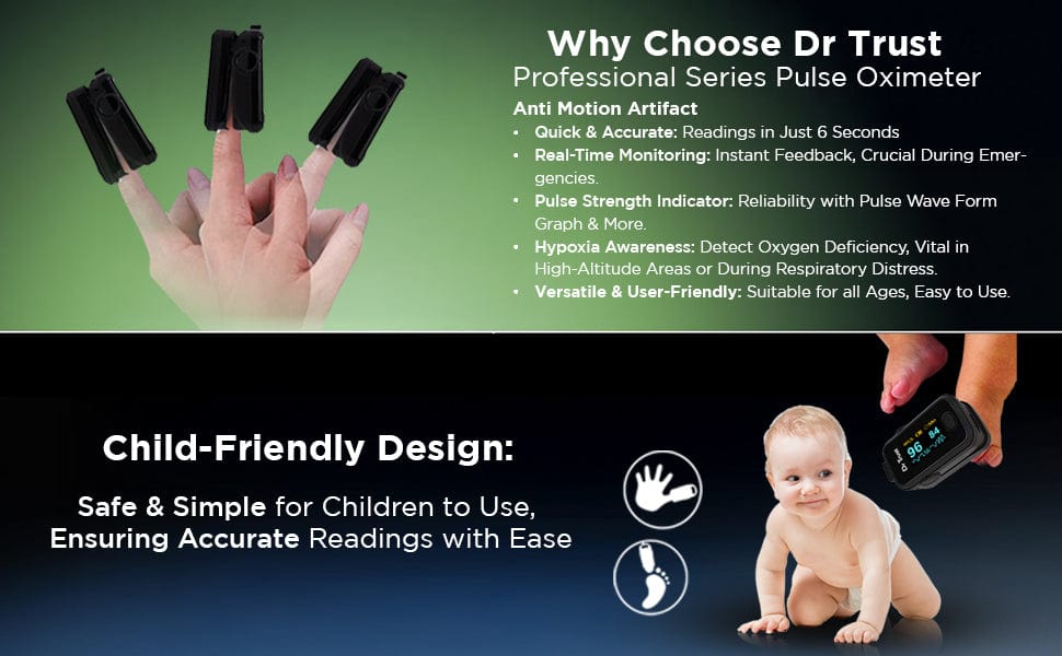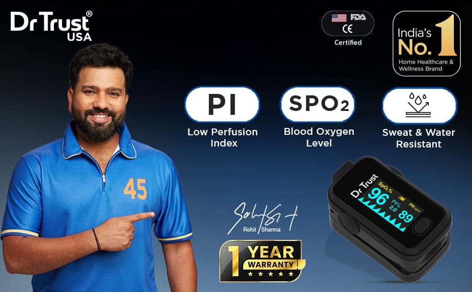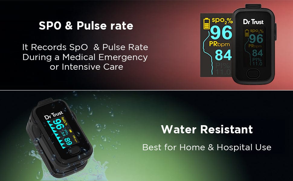Designed for accuracy and ease of use, the Dr Trust Vital Pulse Oximeter provides quick and precise monitoring of SpO2 (blood oxygen saturation) and pulse rate. Ideal for individuals with respiratory or heart conditions, athletes, seniors, pregnant women, and those recovering from illnesses, this compact pulse oximeter empowers proactive health management with reliability and convenience.