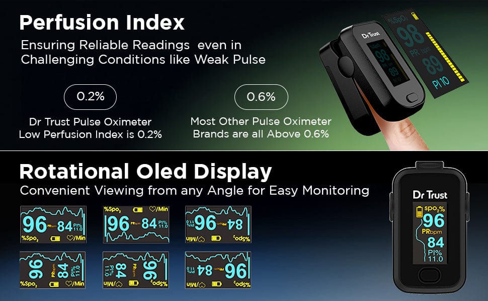 Equipped with an advanced sensor and cutting-edge algorithm, the Dr Trust Pulse Oximeter accurately detects pulse strengths as low as 0.2%, ensuring precise SpO2 and pulse rate readings even in challenging conditions like low perfusion index or poor circulation. Pulse Oximetry test is important for individuals with varying blood flow, it provides dependable results when you need them most.