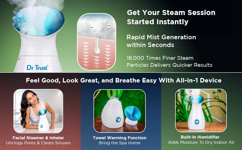 - नैनो-एटोमाइजेशन स्टीमिंग यूनिट: डॉ ट्रस्ट 3-इन-1 आयनिक स्टीमर के साथ त्वचा की सभी समस्याओं को अलविदा कहें, नैनो-एटोमाइजेशन तकनीक के साथ, यह स्टीमर छिद्रों को खोलता है और उन्हें साफ करता है।