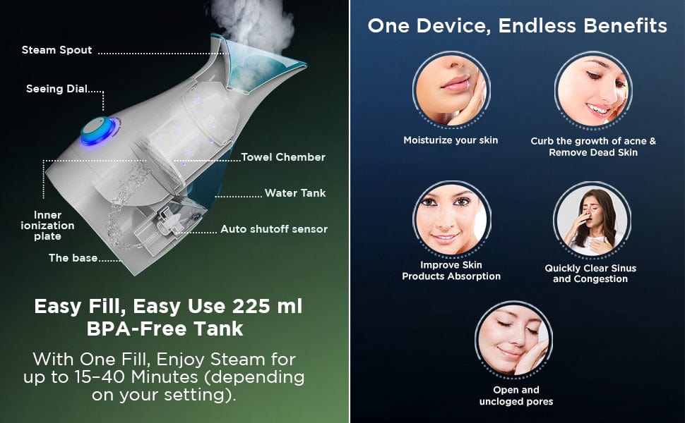 स्टीमर आपको ब्लैकहेड्स, व्हाइटहेड्स और मुँहासे को कम करके आपकी त्वचा की समग्र बनावट में सुधार करने के लिए स्पा अरोमाथेरेपी की अनुमति देता है। यह सेल जीवन शक्ति और त्वचा के चयापचय को बढ़ावा देता है और उम्र बढ़ने के संकेतों का मुकाबला करता है। प्रदान किए गए बीकर में आवश्यक तेल, दूध, कच्ची सब्जियां और फल आदि डालें और बीकर को स्टीमर के अंदर खोखले डिजाइन में रखें ताकि आपकी त्वचा में फ्यूमिगेटिंग हो सके।