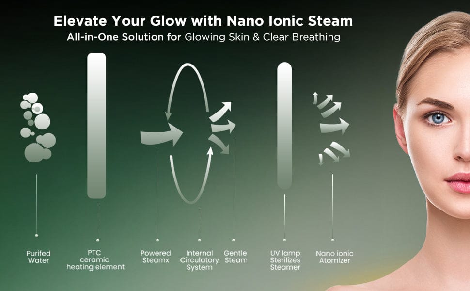 स्टीमर एक विशेष प्रकार की भाप का उत्पादन करने के लिए एक नैनो आयोनिक स्टीमिंग तकनीक का उपयोग करता है जो त्वचा के अंदर गहराई तक प्रवेश करती है जिसके परिणामस्वरूप रक्त परिसंचरण में 10 गुना सुधार होता है। विशेष प्रकार के ताप तत्वों से लैस, यह उपकरण पानी को जल्दी से गर्म करता है और 18,000 गुना बेहतर भाप के कण पैदा करता है। ये कण त्वचा के छिद्रों में गहराई तक घुस जाते हैं और मृत त्वचा, विषाक्त पदार्थों और कॉस्मेटिक अवशेषों को प्रभावी ढंग से हटा देते हैं।