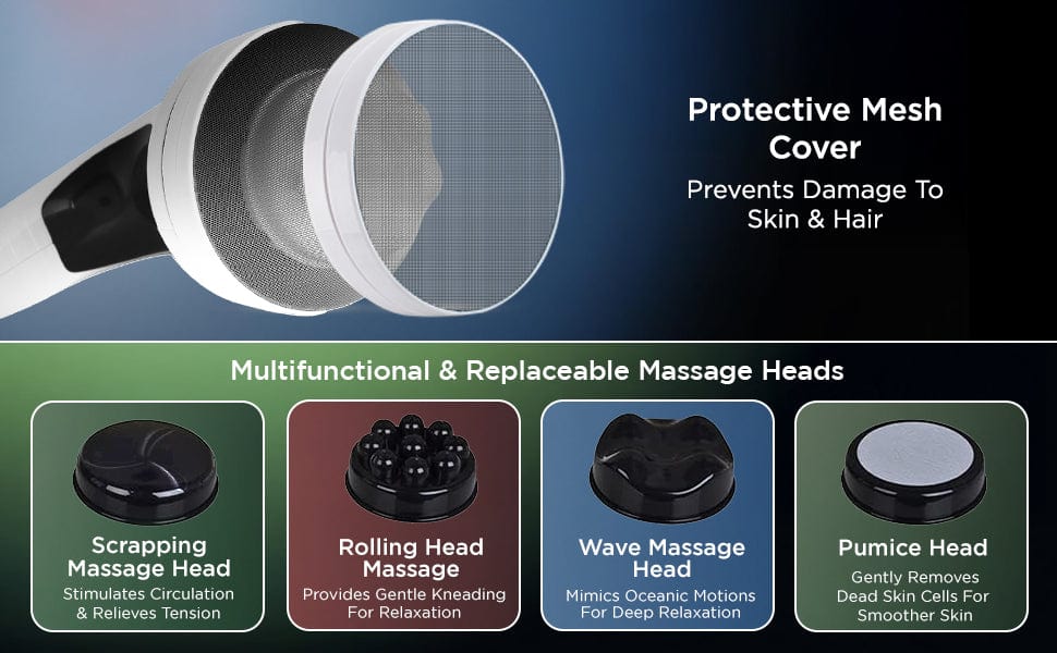 मसाजर अधिकतम लाभ प्रदान करने के लिए रोलिंग हेड, वेव हेड, स्क्रेपिंग हेड और प्यूमिस हेड सहित चार बदलने योग्य मसाज हेड के साथ आता है। ये मसाज हेड तेजी से मांसपेशियों में दर्द से राहत के लिए डीप टिश्यू मसाज प्रदान करने में मदद करते हैं। झांवा सिर इसे जवां बनाने के लिए मृत त्वचा कोशिकाओं को धीरे से हटाता है।