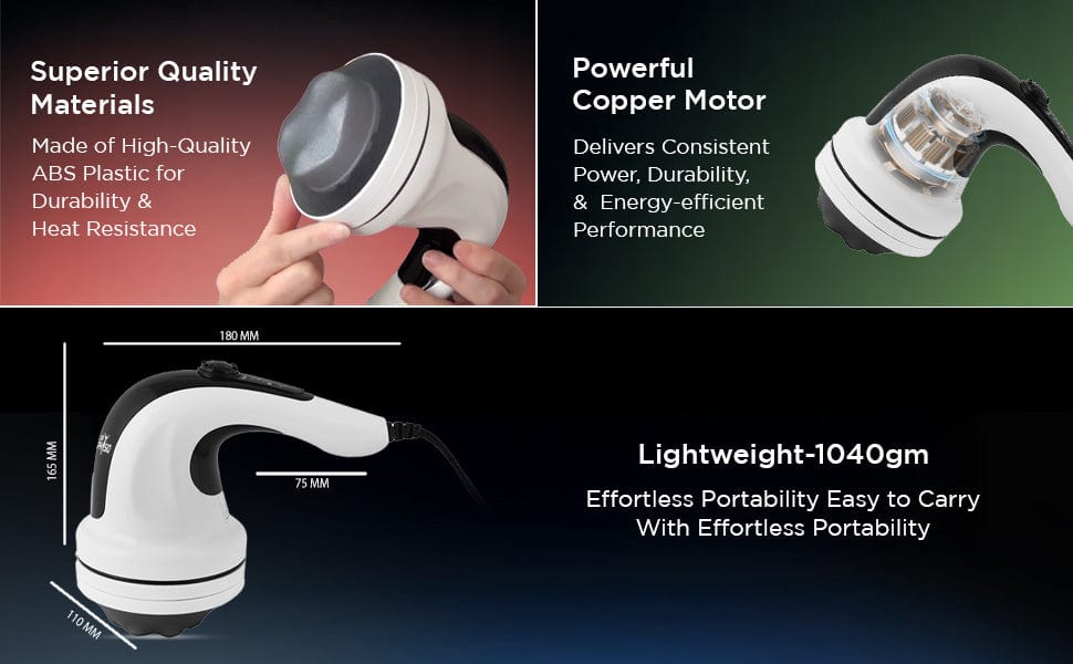 मालिश का उपयोग शरीर के सभी अंगों पर आसानी से किया जा सकता है। वजन सिर्फ 1040 ग्राम और आकार 180 मिमी X 110 मिमी X 165 मिमी, मालिश हाथ में है और समग्र शरीर पर उपयोग करने के लिए लचीला है। लंबे समय तक मसाज करने के लिए आप इसे आराम से पकड़ भी सकते हैं।