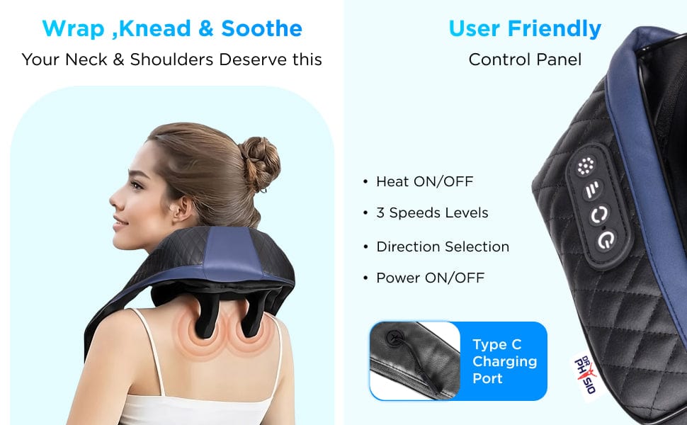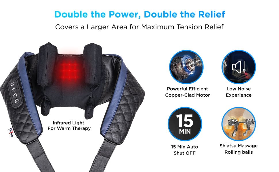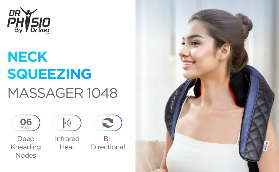 Recharge, relax, and relieve pain—anytime, anywhere with Dr Physio Rechargeable Neck Squeezing massager! Enjoy a deep-kneading massage that melts away muscle tension and stiffness in your neck, shoulders, and back. With six powerful shiatsu massage heads, this device targets pressure points for instant relief from stress, fatigue, and soreness. Designed for convenience, this cordless, rechargeable massager comes with a backpack-style strap for hands-free use. Wear it anywhere—at home, in the office, or while traveling. The ultra-quiet motor ensures a peaceful experience, while the simple controls make it effortless to use. The built-in heat therapy enhances blood circulation, soothes stiff muscles, and adds extra comfort to your massage. Choose from three intensity levels to customize your experience—whether you need a gentle touch or an intense deep-tissue massage. Safety is a priority with an automatic shut-off feature. Plus, the removable, washable cover keeps it clean for daily use.