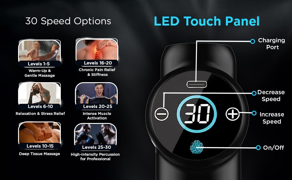 Enjoy precise control with the state-of-the-art touchscreen display, which shows real-time battery life to avoid interruptions. The (+) and (-) controls allow you to adjust speed levels seamlessly, delivering a personalized experience—from gentle relaxation to deep tissue relief.