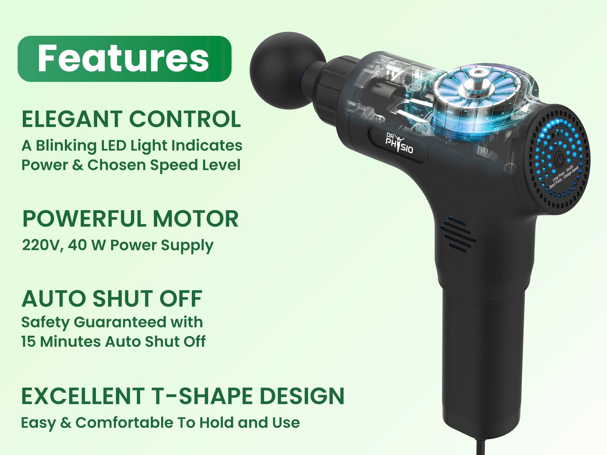 यह आरामदायक ग्रिप के साथ हैंडहेल्ड पोर्टेबल गन मसाजर है। इसमें टी-आकार की हैंडग्रिप डिज़ाइन है जो कंपन के प्रभाव को कम करती है और इसे लंबे समय तक उपयोग करने के लिए आरामदायक बनाती है। जबकि एक कुशल वेंटिलेशन सिस्टम उपयोग के दौरान गर्मी को कम करता है और प्रदर्शन में सुधार करता है।
