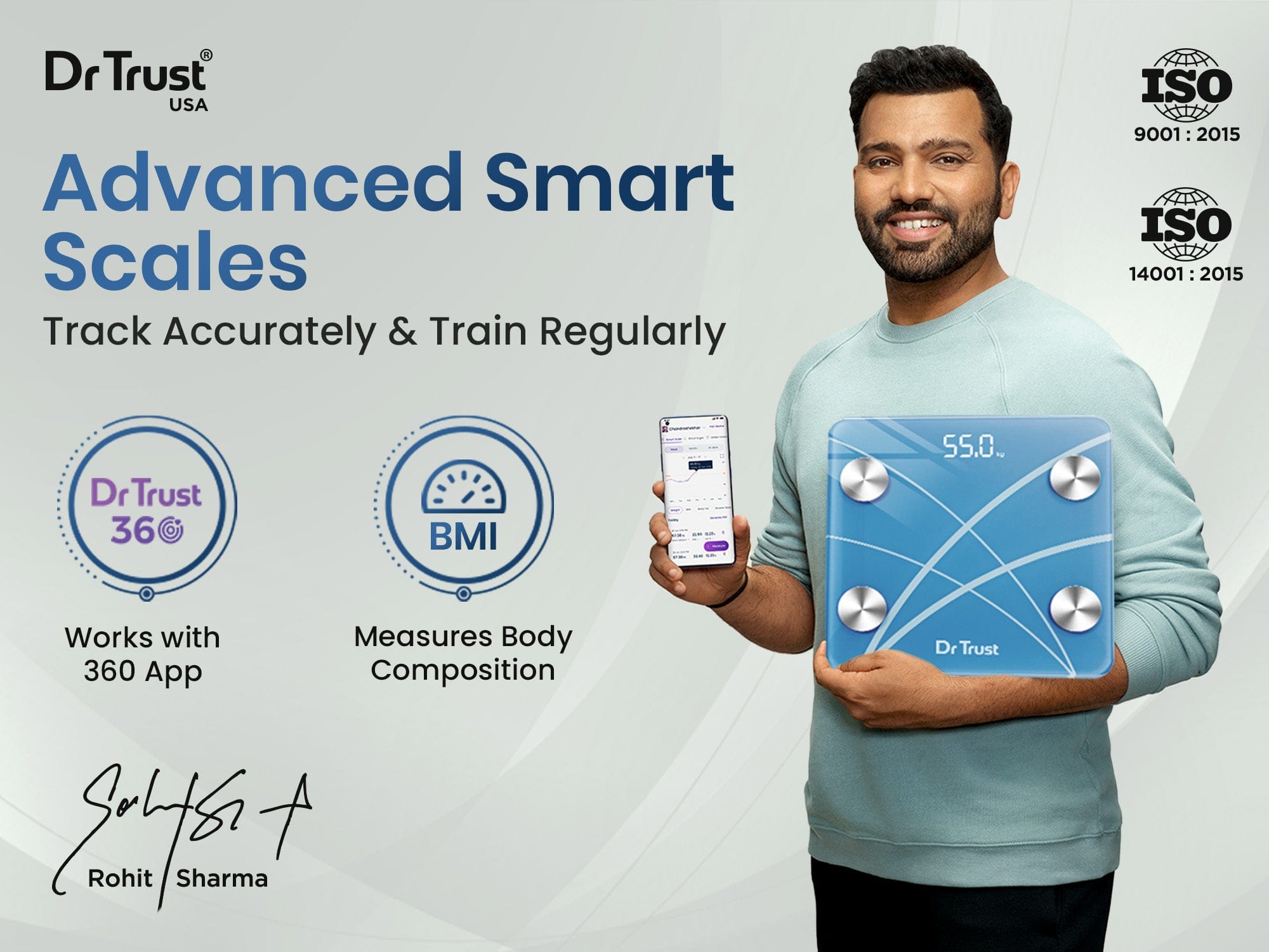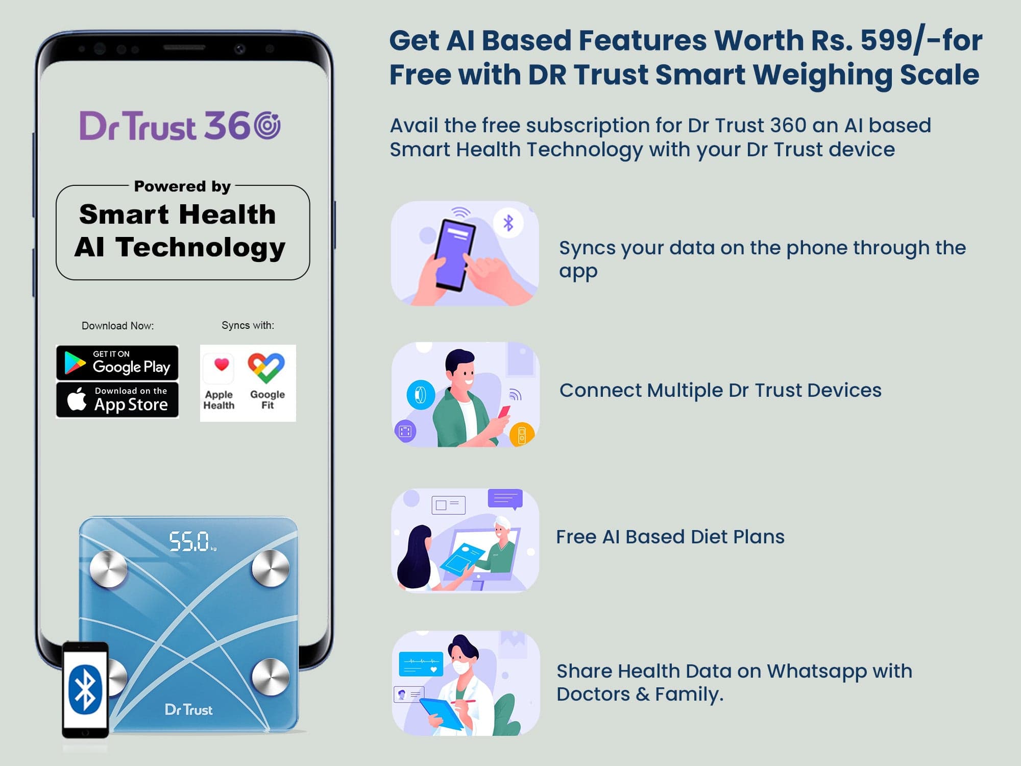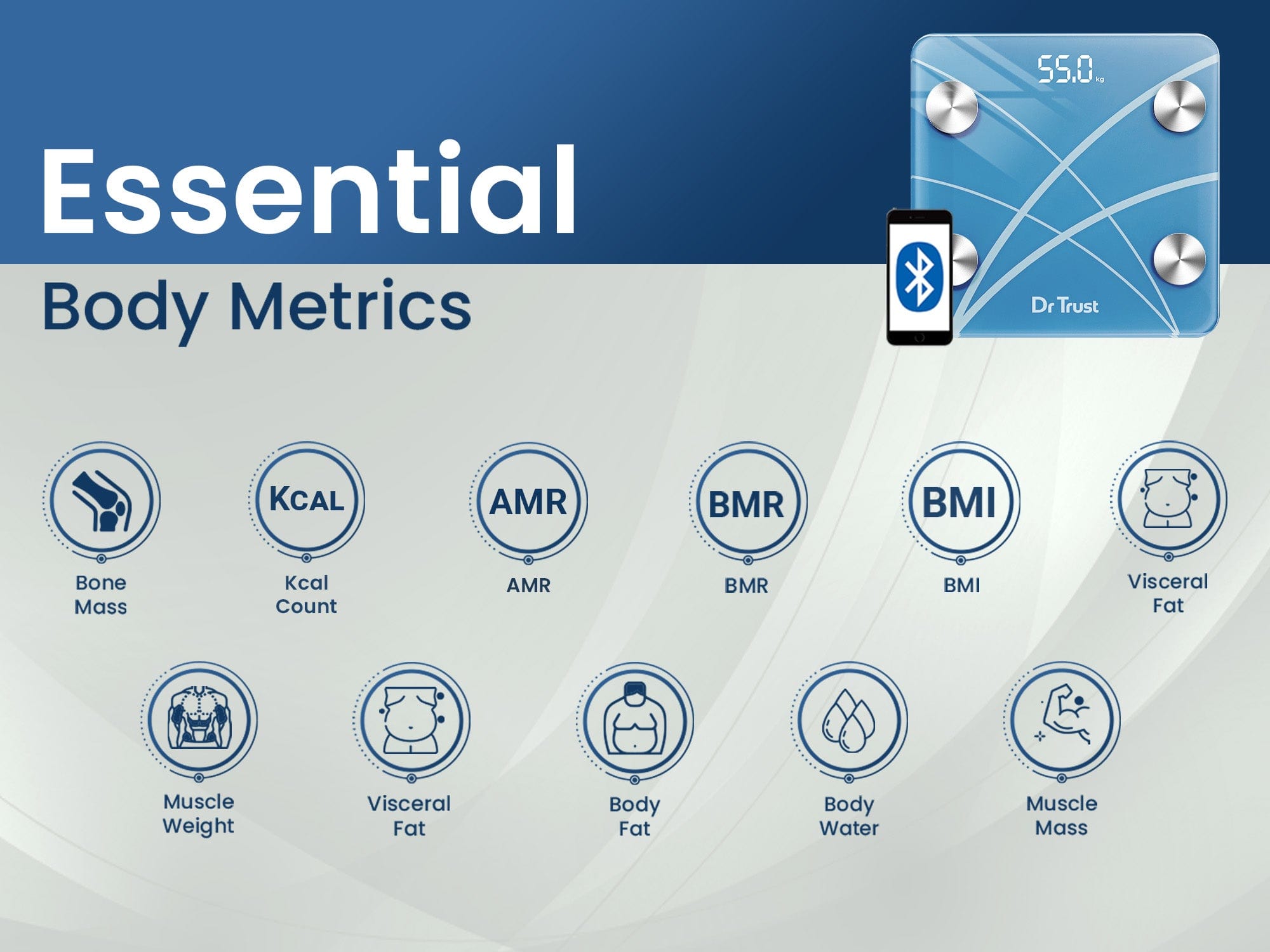 हमारा पैमाना आपको डॉ ट्रस्ट 360 ऐप में सभी आवश्यक बॉडी मेट्रिक्स को ट्रैक करने और सहेजने की अनुमति देता है। ऐप में समग्र बॉडी मेट्रिक्स के करीबी विश्लेषण के लिए ब्लूटूथ-सक्षम स्केल को Android और Apple उपकरणों के साथ आसानी से जोड़ा जा सकता है।