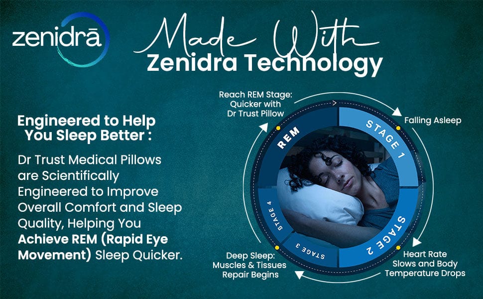 Our neck rest pillow is equipped with advanced Zenidra technology, a cutting-edge innovation designed to enhance your sleep experience. Whether you struggle with sleep apnea, insomnia, snoring or any other serious sleep disorder, or simply want to enhance your sleep quality, Zenidra technology offers a solution tailored to your needs. It is the best pillow if you're seeking improved rest, enhanced relaxation, or quicker access to the rejuvenating REM (Rapid Eye Movement) sleep phase.
