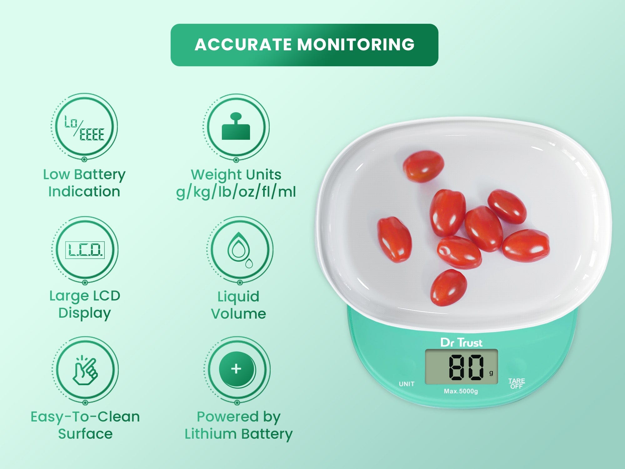 Precision weighing for healthy cooking and portion control, designed for effortless kitchen convenience.