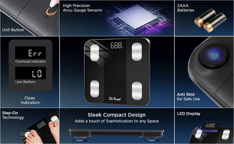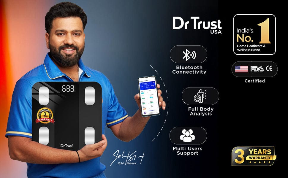 Take control of your health with the Dr Trust Legend Smart Body Fat Scale-526! This BMI fat analyzer weighing machine syncs with the Dr Trust 360 app, making it perfect for personal or family health tracking. With comprehensive features and precise data analysis, our weighing machine with body fat analyzer helps you proactively manage your health. Its user-friendly design, advanced technology, and detailed progress tracking make it essential for both personal and family use. Why Choose Dr Trust Fat Analyzer and Composition Scale-526? This safe and sturdy digital personal weight machine with body fat percentage provides accurate measurements of weight, BMI, fat percentage, visceral fat levels, and more. While connectivity with the Dr Trust 360 app makes our weight machine for body fat easy to track and get detailed insights into your health goals. Moreover, this is a reliable health partner in achieving your fitness goals and maintaining better health for you and your family!