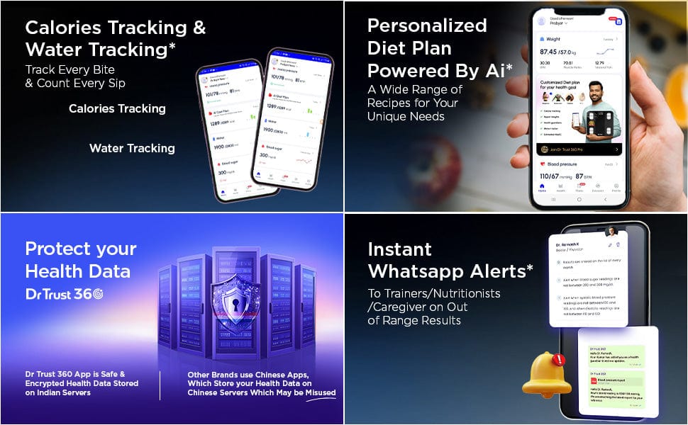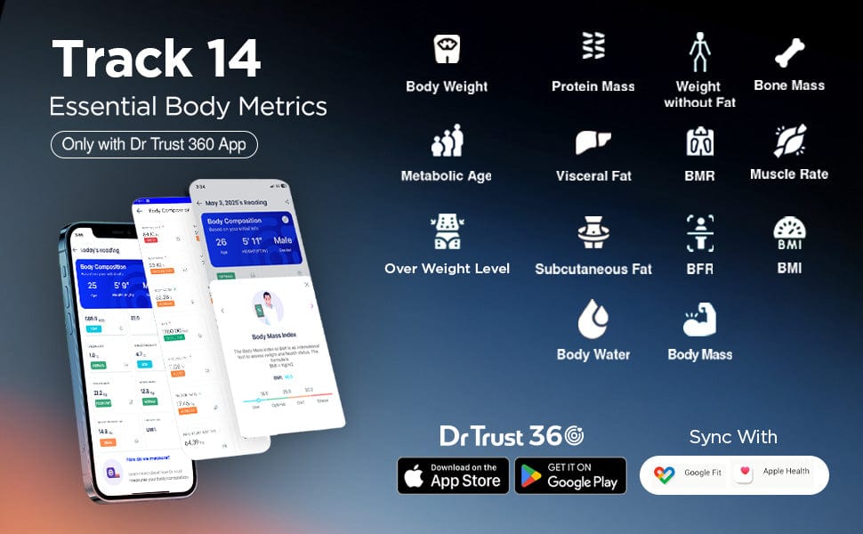 Analyze 14 key body metrics including weight, fat, BMI, and more with the Dr Trust 360 App for accurate health monitoring.