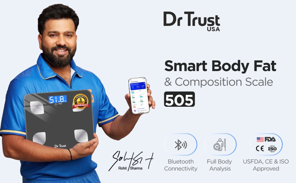 स्केल त्वरित परिणामों के रूप में बेजोड़ सटीकता और विश्वसनीयता सुनिश्चित करता है। यह सटीकता के लिए सेंसर तकनीक से लैस है। यह आपके मोबाइल डिवाइस से कनेक्ट किए बिना सामान्य वेइंग स्केल के रूप में भी काम करता है। अपना वजन तुरंत मापने के लिए पैमाने पर कदम रखें। यह रिचार्जेबल है और ब्लूटूथ कनेक्टिविटी के साथ आता है। डॉ ट्रस्ट स्मार्ट बॉडी फैट एंड कंपोज़िशन स्केल के साथ, 505 आपको एक पूर्ण शरीर विश्लेषण देता है क्योंकि यह बीआईए तकनीक से लैस है जो आपको 16 बॉडी कंपोज़िशन तक का डेटा देता है। आप अपने फोन पर हर चीज की जानकारी के साथ दिनों और हफ्तों में अपनी प्रगति को ट्रैक करके अपने लक्ष्यों को प्राप्त कर सकते हैं। यह आपके शरीर पर कसरत के परिणामों का विश्लेषण करने के साथ ऐप पर सब कुछ सिंक करता है। प्रगति देखने के लिए आप ग्राफ़ के रूप में बॉडी मेट्रिक्स डेटा की तुलना कर सकते हैं। उत्पाद का टूटना, पानी की क्षति, और टूट-फूट को वारंटी से बाहर रखा गया है। वारंटी उत्पाद में निर्माण दोष को कवर करती है। ग्राहकों को वारंटी के तहत मरम्मत के लिए उत्पाद को हमारे सेवा केंद्र में भेजना होगा।