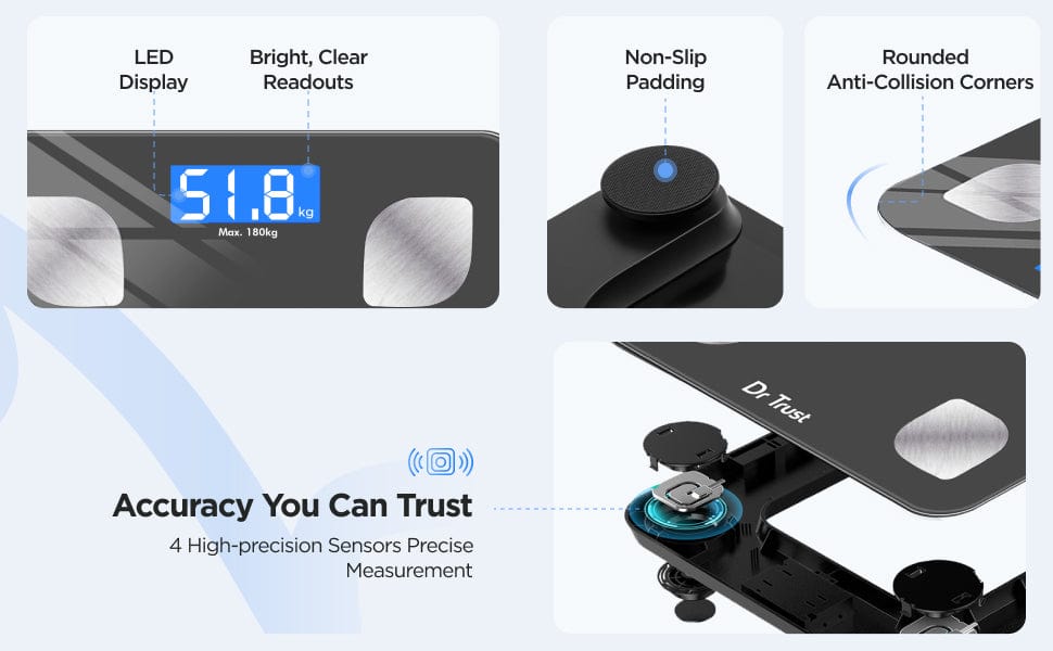 यह आपके मोबाइल डिवाइस से कनेक्ट किए बिना आपके शरीर के वजन को आसानी से देखने और बड़ी एलसीडी स्क्रीन पर प्रदर्शित करता है। यह 180 किलोग्राम तक की अधिकतम वजन क्षमता के साथ शरीर के वजन की निगरानी के लिए उच्च-परिशुद्धता तनाव गेज सेंसर से लैस है ।