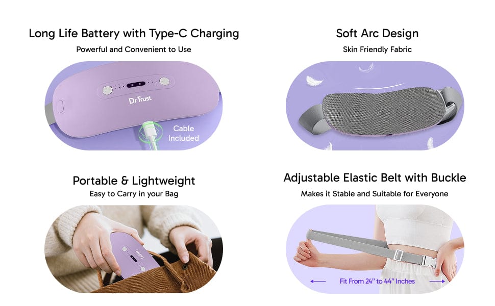 Say goodbye to period cramps and discomfort with the Dr Trust Portable Heating Pad and Massager 389, your ultimate solution for targeted relief from menstrual cramps, muscle aches, and everyday discomfort. Combining soothing heat and customizable massage, this hands-free, cordless device delivers up to five hours of relief on a single charge. Its compact design makes it perfect pain relief partner for women during use at home, in the office, or while traveling. With 3 adjustable heat settings and 3 massage modes, you can easily set it to your preferences—whether you need gentle warmth or deep relaxation. The adjustable waistband fits waists up to 56 inches, ensuring a snug and secure fit for all body types. The user-friendly LED display and one-button control make operation effortless, while the automatic 15-minute shutoff feature ensures safety. Durable and long-lasting, this menstrual stomach pain relief heating belt is a reliable, non-invasive solution for managing pain effectively. Perfect for whenever and wherever you need it, the Dr Trust Portable Heating Pad and Massager is a must-have addition to every women wellness routine, offering tailored comfort with every use.