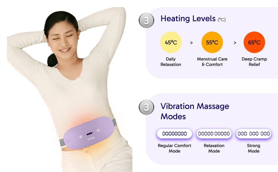 Say goodbye to menstrual cramps and muscle aches with a combination of adjustable heat and three massage modes. The built-in heat therapy soothes cramps while promoting calmness. Choose from three heat settings: Low (45°C) for gentle warmth, Medium (55°C) for moderate relief, or High (65°C) for deep, soothing heat. The intuitive control panel makes it easy to adjust settings, putting comfort at your fingertips.