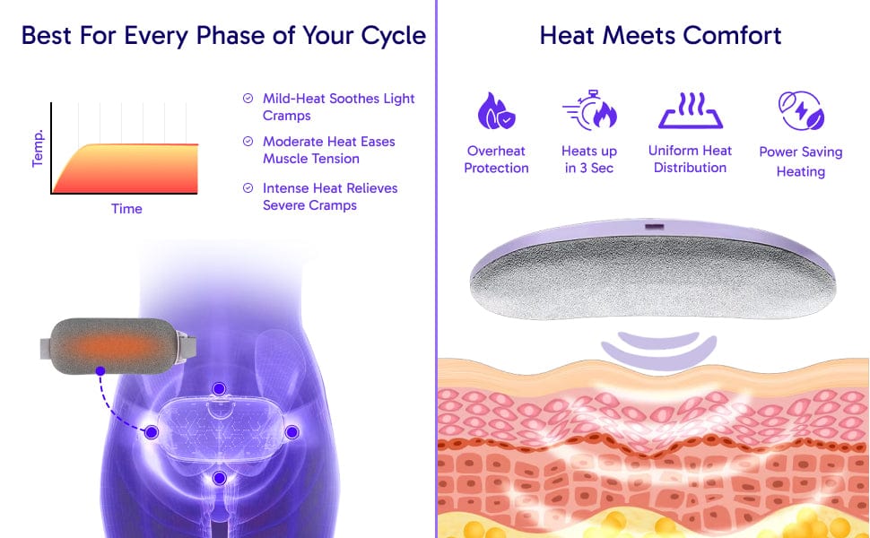 Experience targeted warmth blended with soft massage therapy — easing cramps, calming discomfort, and keeping you comfortable anytime.