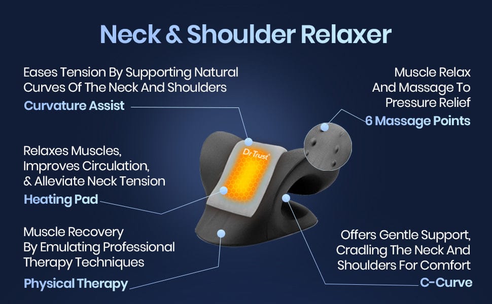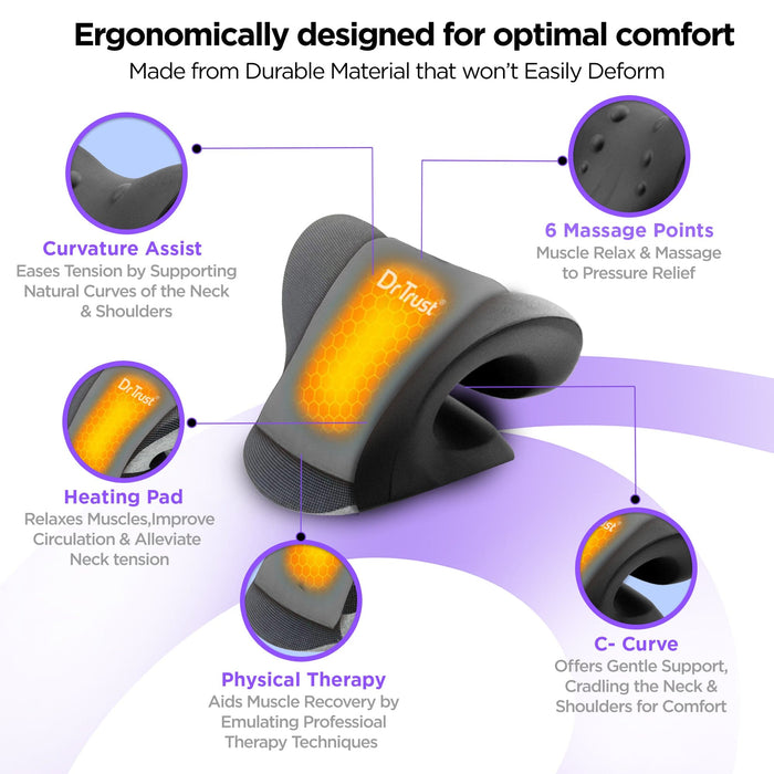 Say goodbye to neck pain and embrace a life of comfort and relaxation. Invest in your well-being with the Dr Trust Neck Stretcher and Relaxer with Heat Pad – where cutting-edge technology meets thoughtful c-shape design to provide you with the ultimate neck care experience. This gravity-assisted neck traction device employs the force of gravity to gently pull the head backward, expanding and separating the vertebrae. Focus on your spinal health with this therapeutic approach, and let the Dr Trust Neck Stretcher and Traction device rejuvenate your neck through curvature assist and ergonomic design that adapts to your body's contours. The innovative neck contraction device combines the benefits of heat therapy, targeted massage, and ergonomic design to provide you with a comprehensive neck care experience.