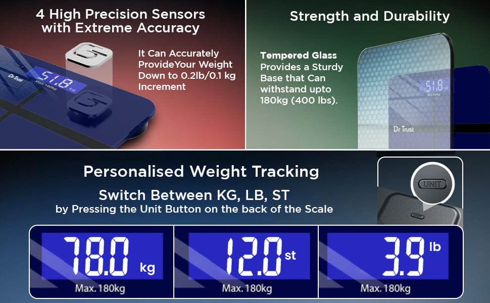 Our product comes with patented accu-gauge sensors technology for high precision weight measurement to the closest 180Kg/397IB. You just need to stand on the weighing machine, and it will show your accurate weight practically in no time.