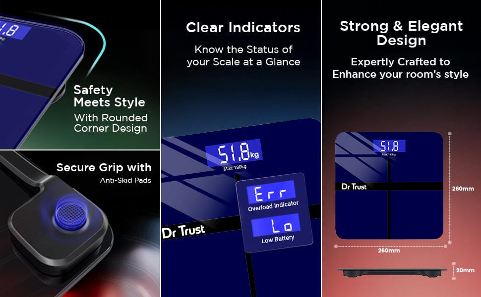 Experience the strength and reliability of the Dr Trust USA Executive Rechargeable Digital Personal Weighing Scale 502. This sturdy scale is designed to provide accurate readings for up to 180 kg every time, ensuring your weight-tracking journey remains easy. Say hello to precision, reliability, and convenience in your daily routine. Features a clear blue backlight display to ensure easy visibility of readings. This is the ultimate solution for accurate weight measurement at home. Engineered with patented Accu Gauge Sensor technology, this digital scale ensures precision and reliability with every use. It comes with a USB cable for convenient recharging. It also alerts you when the weight exceeds the 180 kg weight capacity.