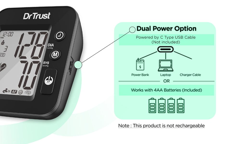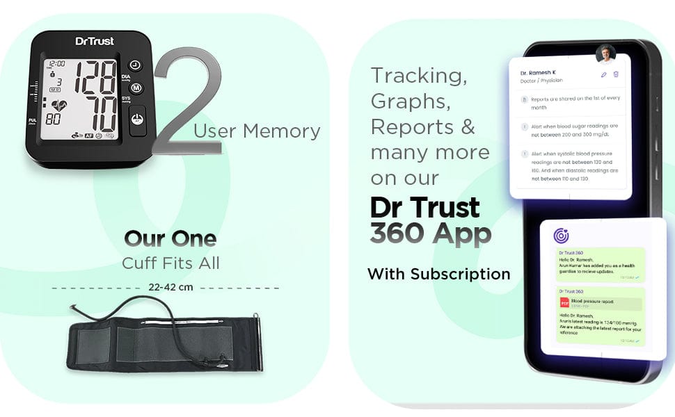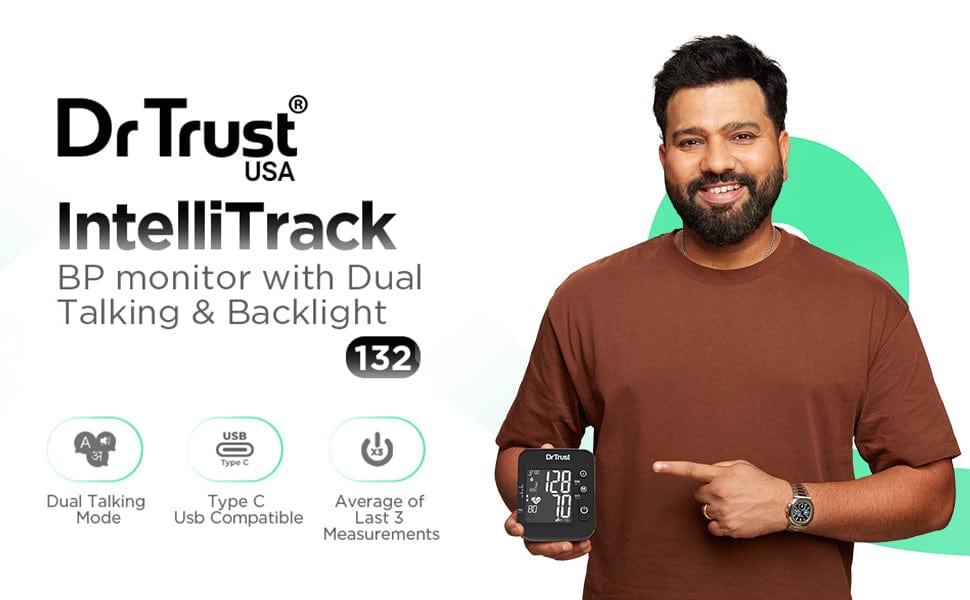 Why Choose Dr Trust IntelliTrack BP Monitor? The Dr Trust IntelliTrack BP Monitor with Dual Talking is a cutting-edge device designed for precise and user-friendly blood pressure monitoring. Equipped with advanced technology, it provides accurate readings and calculates the average of the last three measurements for deeper health insights. Its dual talking functionality in English and Hindi, with a mute option, makes it accessible for all, while the bright backlight display ensures clear visibility even in low-light conditions. The monitor operates with dual power options—4 AAA batteries or a Type-C USB cable—offering flexibility and uninterrupted usage with smart features like auto shut-off and a low-battery indicator. The universal cuff (22–42 cm) fits a wide range of arm sizes, ensuring comfort and accuracy for every user. Compact, reliable, and easy to use, this BP monitor is the perfect companion for tracking and managing your cardiovascular health, whether at home or on the go. Moreover, this cutting-edge BP monitor combines precision, ease of use, and thoughtful features to make blood pressure monitoring accessible and efficient for everyone. Whether you’re managing your health at home or need a reliable travel companion, the Dr Trust IntelliTrack BP Monitor ensures you’re always in control of your cardiovascular health.