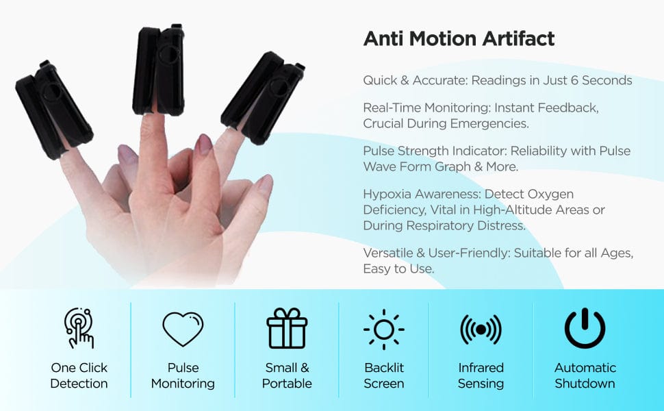 Our Oximeter is designed for the non-invasive measurements of the pulse rate and Arterial Blood Oxygen Saturation (SpO2). This device shows a real-time reading within 6 seconds and shuts down automatically when you remove your finger.