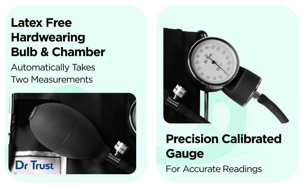 உங்கள் இதயம் மற்றும் இரத்த நாளங்களின் செயல்திறனை அளவிட எங்கள் சாதனம் ஒரு அனெராய்டு பொறிமுறையைப் பயன்படுத்துகிறது. சிஸ்டாலிக் மற்றும் டயஸ்டாலிக் பிபியை அளவிடுவதற்கு கைமுறையாக இயக்கப்படும் பல்ப் மற்றும் வால்வு மூலம் பணவீக்கத்திற்கான ஒரு பொறிமுறையைப் பயன்படுத்துவதற்கு இது அனெராய்டு கேஜ் மற்றும் ஊதப்பட்ட சுற்றுப்பட்டை ஆகியவற்றைக் கொண்டுள்ளது.