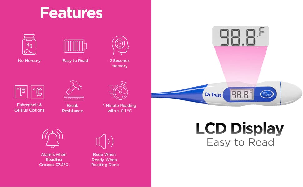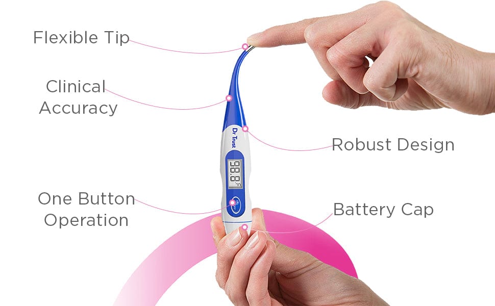 இது மிகவும் துல்லியமான ஃப்ளெக்ஸி டிப் தெர்மோமீட்டர் ஆகும், இது எளிமையான ஒரு பட்டன் செயல்பாடுகள் மற்றும் நுனியில் அமைந்துள்ள சென்சார் ஆகும். அதன் சென்சார் உடலின் அந்த பகுதியைத் தொடும்போது அது உடல் வெப்பநிலையை விரைவாகப் படிக்கிறது. இது மலக்குடலாகவோ, வாய்வழியாகவோ அல்லது அக்குள் வழியாகவோ பயன்படுத்தப்படலாம் மற்றும் குழந்தையின் உடல் வெப்பநிலை அளவீடுகளை எடுக்க மிகவும் வசதியானது. இது நினைவக செயல்பாடுகளைக் கொண்டுள்ளது, இது கடைசி வெப்பநிலை வாசிப்பை எளிதாக நினைவுபடுத்துகிறது. எல்லா வயதினருக்கும் இது ஒரு சிறந்த தேர்வாகும்.