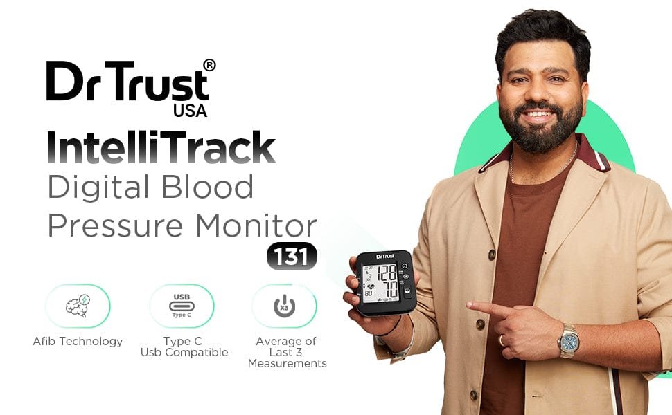 Looking for a reliable and advanced BP machine with Afib detection feature? The Dr Trust IntelliTrack BP Monitor 131 is a cutting-edge health device designed for precise and comfortable blood pressure monitoring anytime anywhere. Equipped with advanced features like AFIB and Arrhythmia detection, it helps identify stroke risks and irregular heart activity early. With 2- users memory storing up to 120 readings each and average calculations of the last three measurements, it ensures detailed health insights. Its MDI Technology guarantees pain-free readings, while the universal cuff (22–42 cm) and large font display make it accessible for all users. Powered by 4 AAA batteries or Type-C micro-USB, with smart additions like auto shut-off and low battery indication, this compact, travel-friendly BP machine ensures health tracking is always within reach.