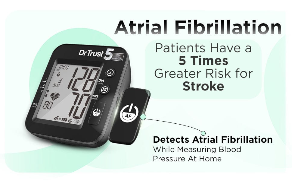 The Dr Trust IntelliTrack BP Monitor combines advanced health monitoring capabilities by measuring blood pressure and detecting Atrial Fibrillation (AFIB) and Arrhythmia in a single sitting. Early detection of AFIB and Arrhythmia can help identify stroke risks and irregular heart activity, allowing you to take timely action. This comprehensive functionality helps you gain deeper insights into your cardiovascular health.