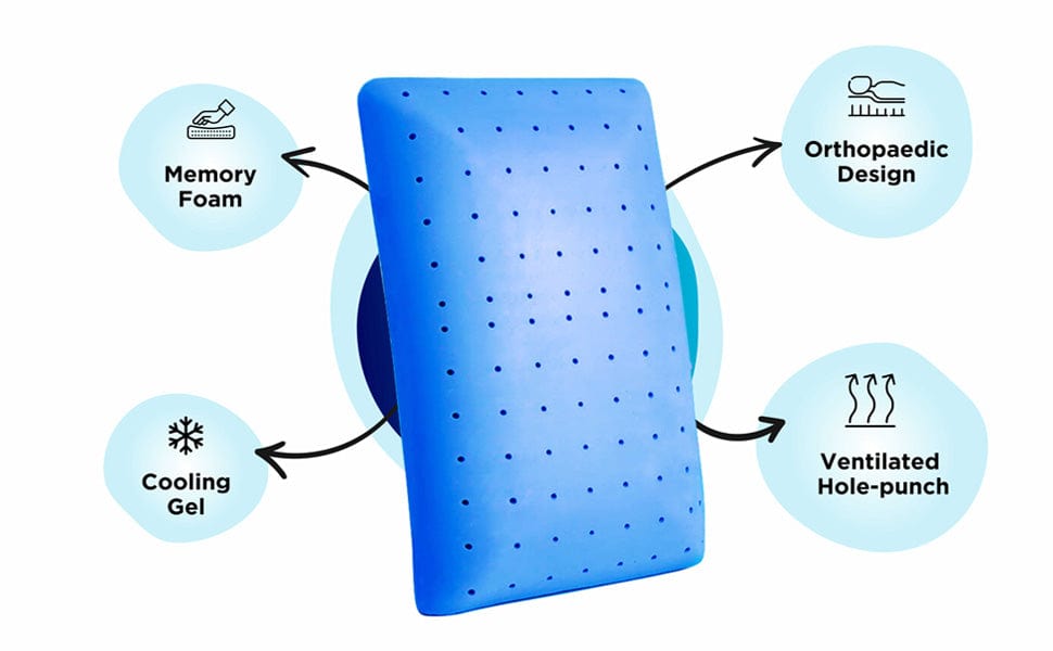 Orthopedic memory foam pillow with cooling gel layer that soothes neck and cervical pain while improving spine alignment.