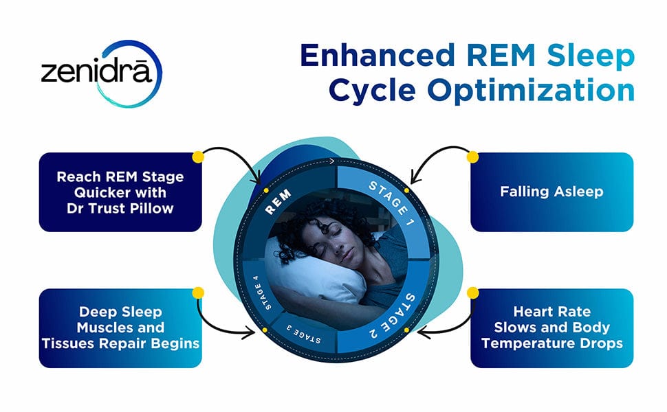 It is a revolutionary sleep solution engineered with Zenidra technology to elevate your sleep experience. This cutting-edge innovation is aimed to cater to your sleep needs, whether you're seeking improved rest, enhanced relaxation, or quicker access to the rejuvenating REM (Rapid Eye Movement) sleep phase.