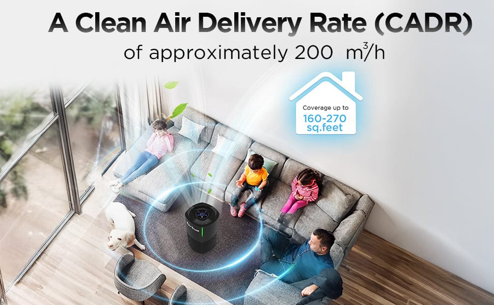 This filter ensures all-around purification with its 360° cylindrical design, efficiently drawing air from every corner of the room. Perfect for spaces up to 270 square feet—like bedrooms, living rooms, or offices—it delivers rapid air circulation and freshness with a CADR of 200 m³/h. Breathe cleaner, fresher air faster!